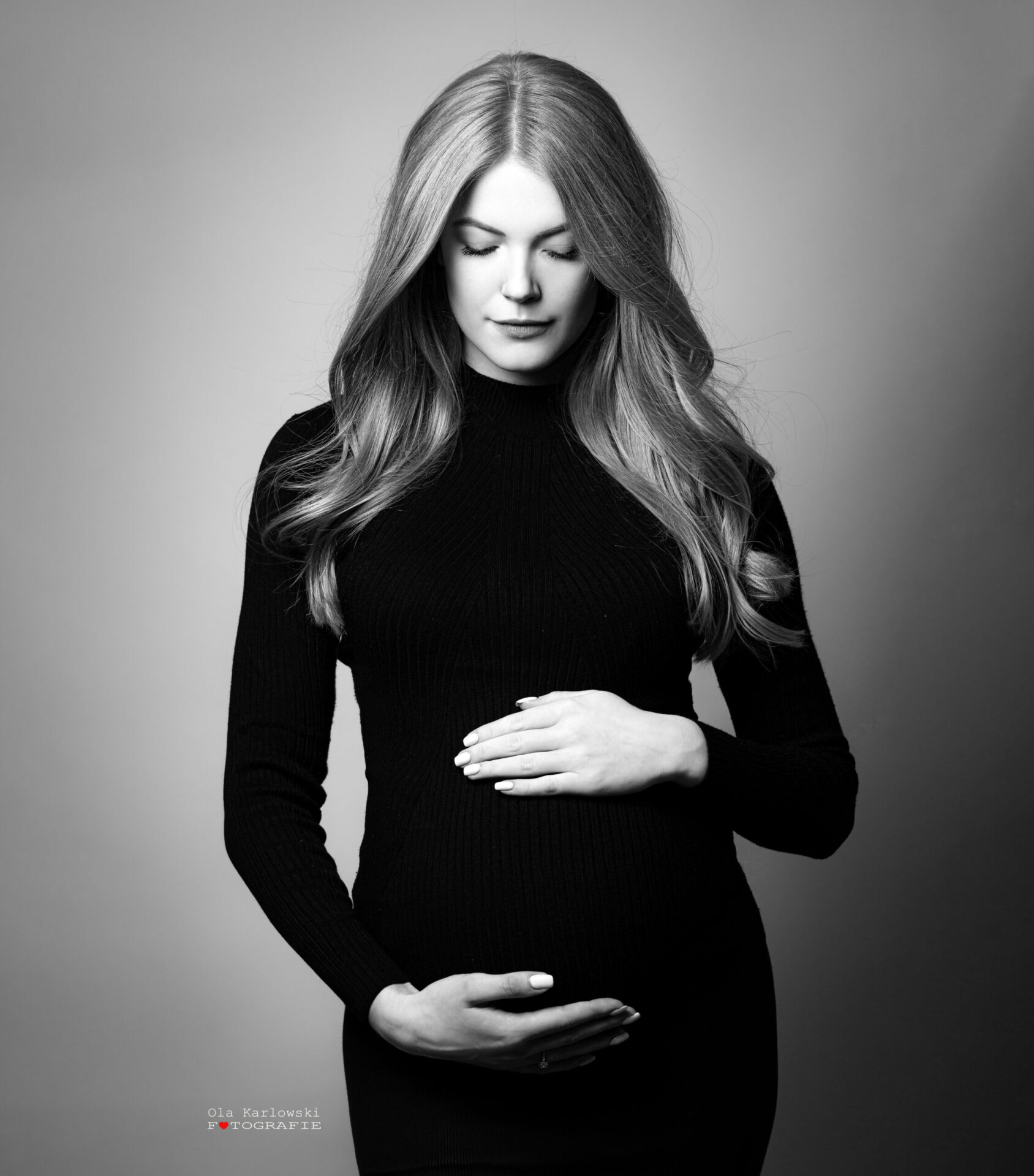 Klassisch-elegante Schwarz-weiß Schwangerschaftsfotografie im Studio in Düsseldorf. Zeitlose Babybauchportraits mit Fokus auf Ästhetik, Licht und natürliche Posen.